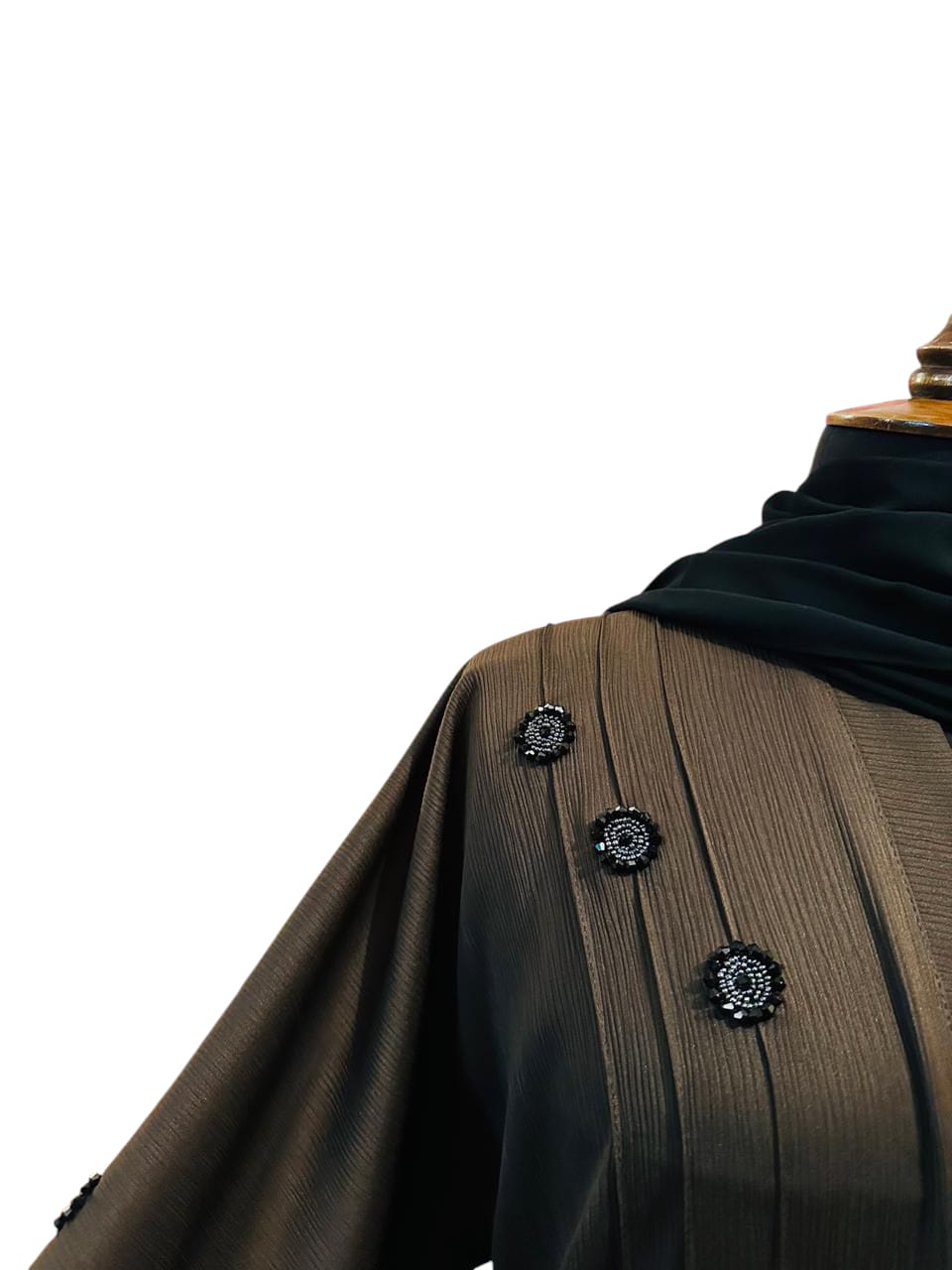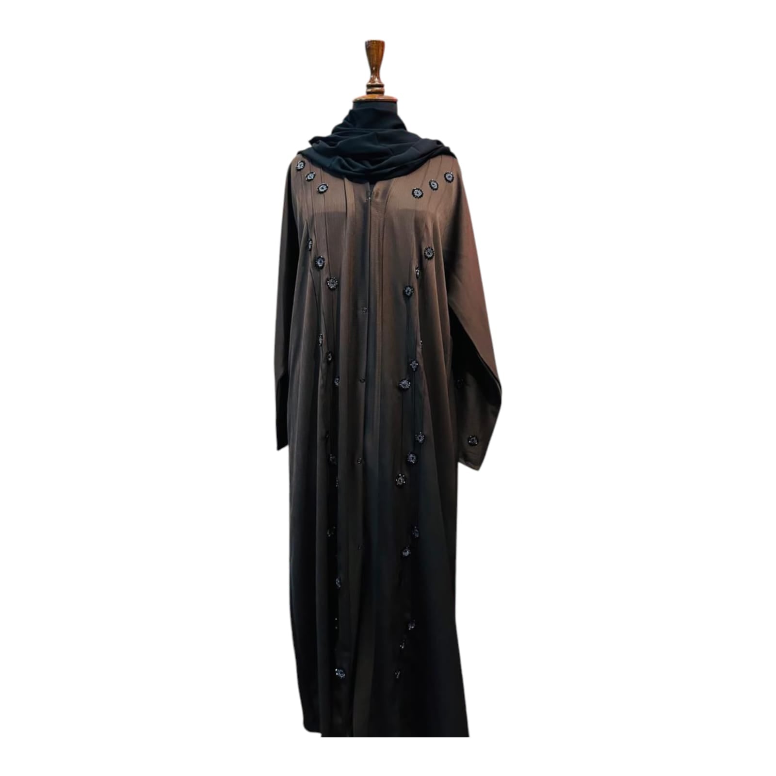 This abaya features crinkle fabric that adds texture and elegance to its silhouette. Detailed with intricate cut dana embroidery, it offers a refined and sophisticated look suitable for formal occasions.