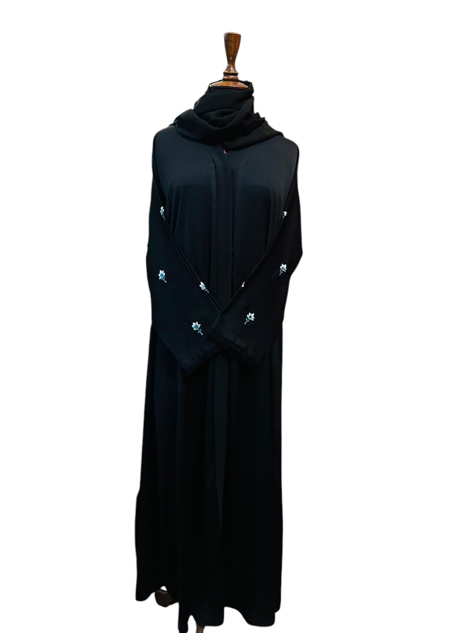This elegant black abaya features intricately designed sleeves adorned with delicate leaf patterns, combining traditional modesty with refined craftsmanship. Its timeless style ensures versatility for various occasions, while the detailed sleeve work adds a subtle yet sophisticated touch to your wardrobe. Perfect for those seeking a blend of classic design and expert tailoring.