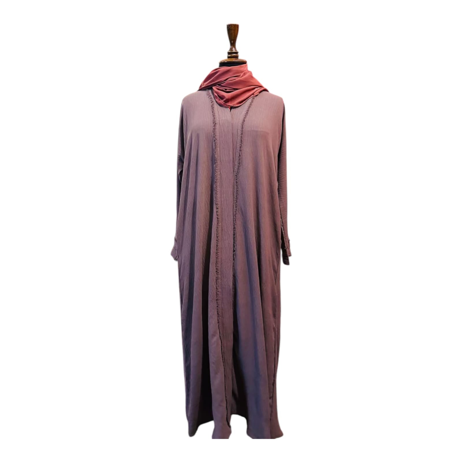 This pastel pink abaya combines subtle elegance with comfort, crafted to offer a graceful silhouette suitable for various occasions.